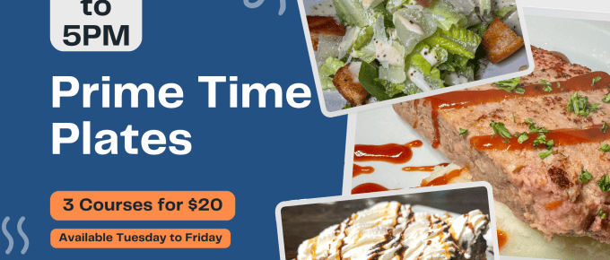 Enjoy Prime Time Plates at Freddy J’s, Tue-Fri, 3-5pm! Savor a $20 three-course meal with options like Shepherd’s Pie, Meatloaf, and more.