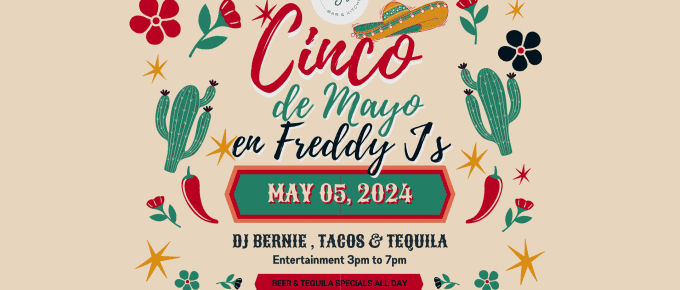 Join us at Freddy J’s for Cinco de Mayo! Enjoy DJ Bernie from 3-7pm and all-day specials on tacos, margaritas, and beer. Celebrate in style!