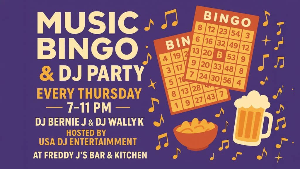 Every Thursday night, USA DJ Entertainment brings the party to Freddy J’s Bar & Kitchen. DJs Bernie J and Wally K spin your favorite pop, rock, hip-hop, and surprise throwbacks as you mark off tracks on your bingo card from 7 PM to 11 PM.
