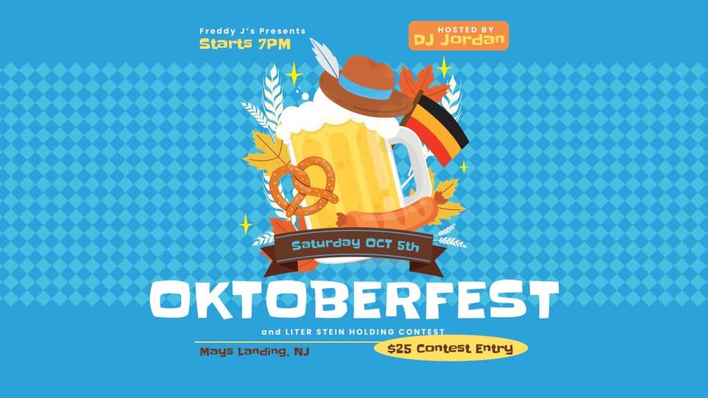 Get ready for the ultimate Oktoberfest celebration at Freddy J’s Bar & Kitchen on Saturday, October 5th, from 7 pm to 11 pm! The night’s highlight is our Stein Holding Contest — a test of strength and endurance that promises to be both challenging and fun!