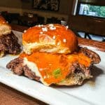 Two (2) smashed patties + Cooper Sharp American Cheese + kimchi burger sauce + King’s Hawaiian Buns Pretzel Slider + fries – 10
